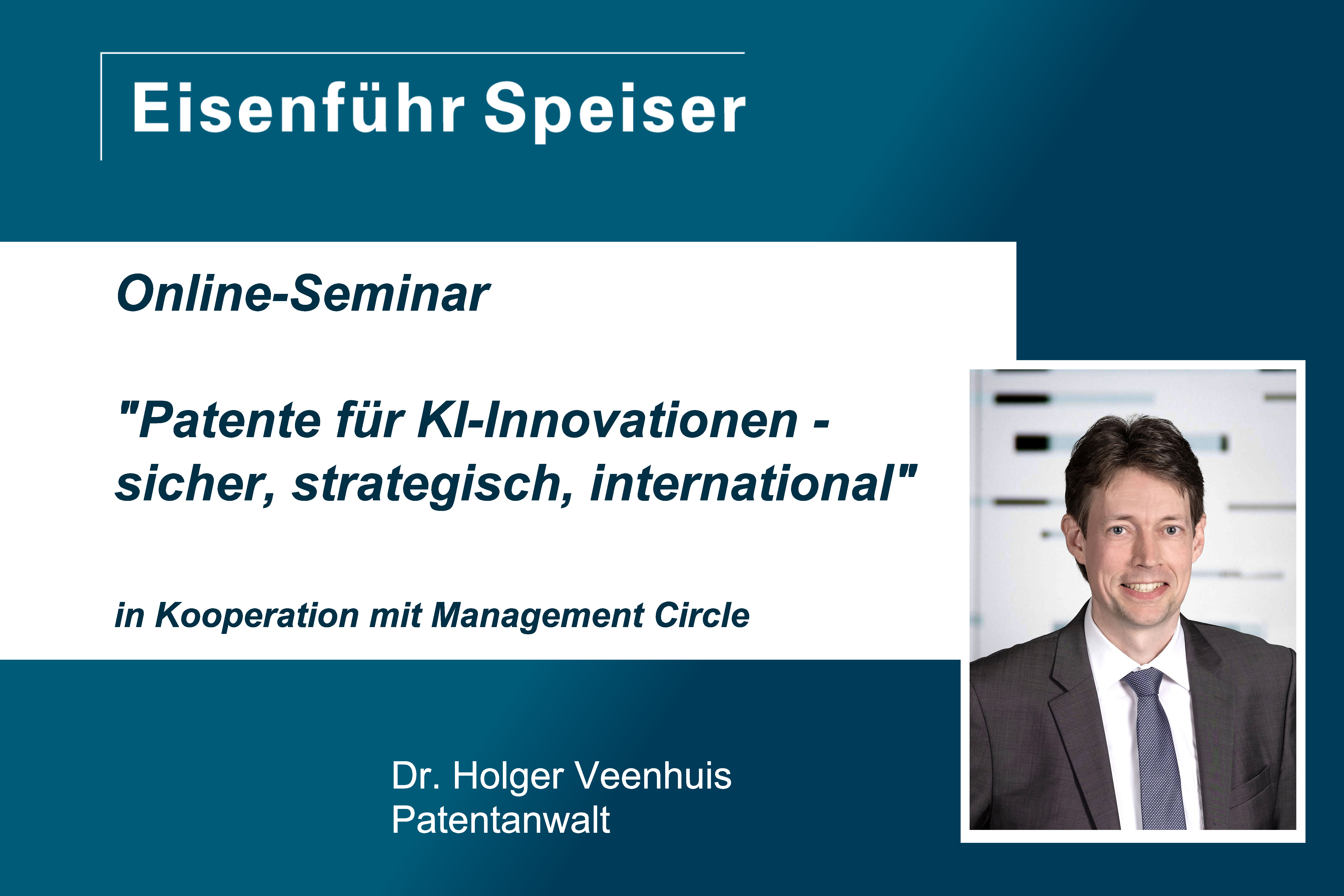 In Kooperation mit dem Seminaranbieter Management Circle bietet Patentanwalt Dr. Holger Veenhuis ein vierstündiges Online-Seminar zur Patentierung von KI-Innovationen an.