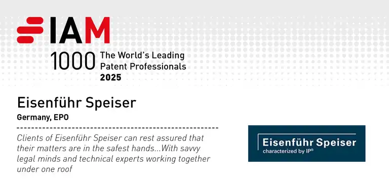 „IAM Patent 1000 – The World’s Leading Patent Professionals“ has published the rankings for the year 2025. Eisenführ Speiser is recommended in the areas of „Prosecution/Nullity“, „Infringement“, „Transactions“ and in the new UPC ranking.