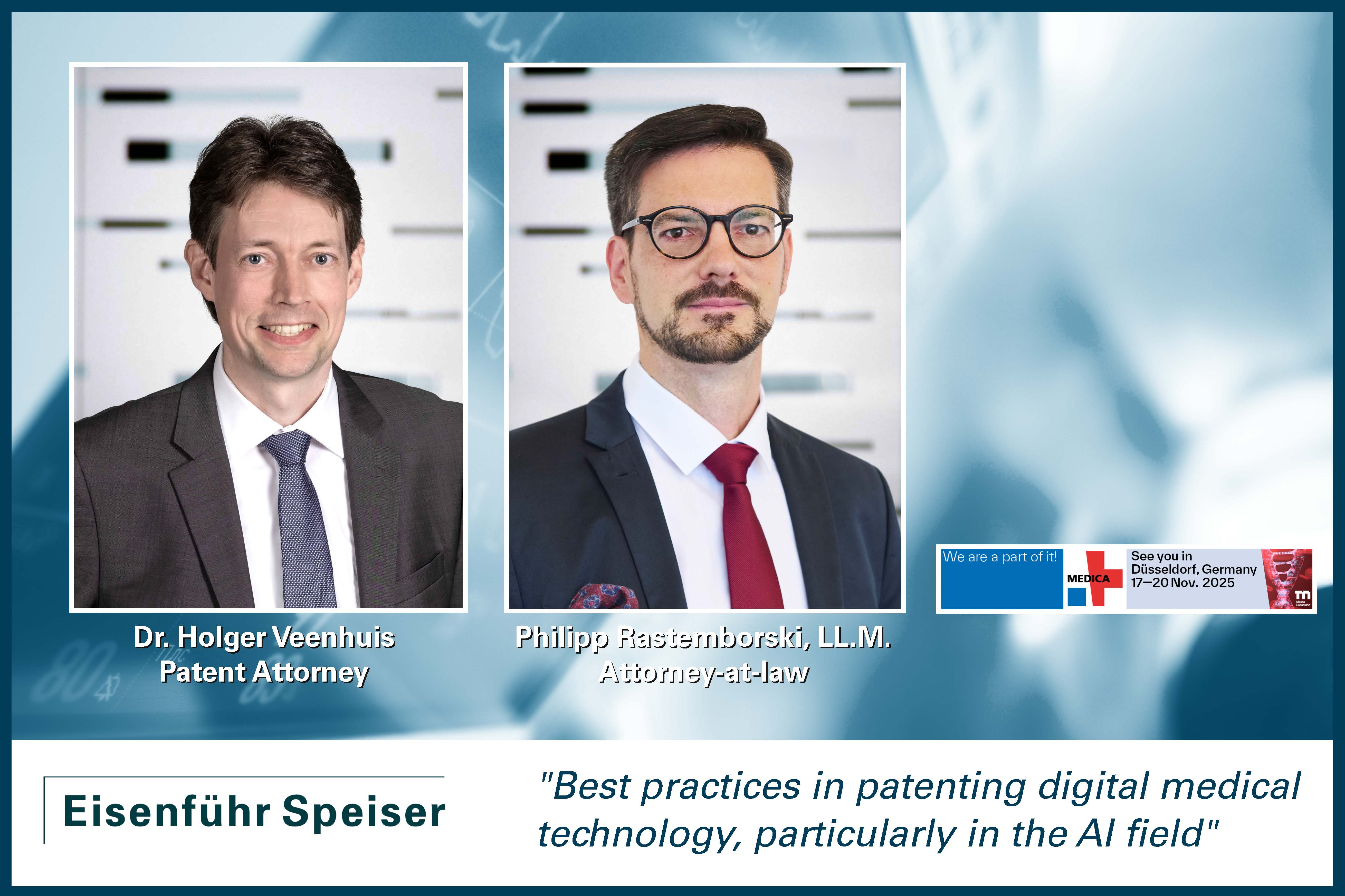 Patent attorney Dr Holger Veenhuis and attorney-at-law Philipp Rastemborski, LL.M., will give a lecture at this year's MEDICA entitled "Best practices in patenting digital medical technology, particularly in the AI field". Among other things, they will provide recommendations for the successful registration and enforcement of patents on digital medical technology, particularly in the field of artificial intelligence.